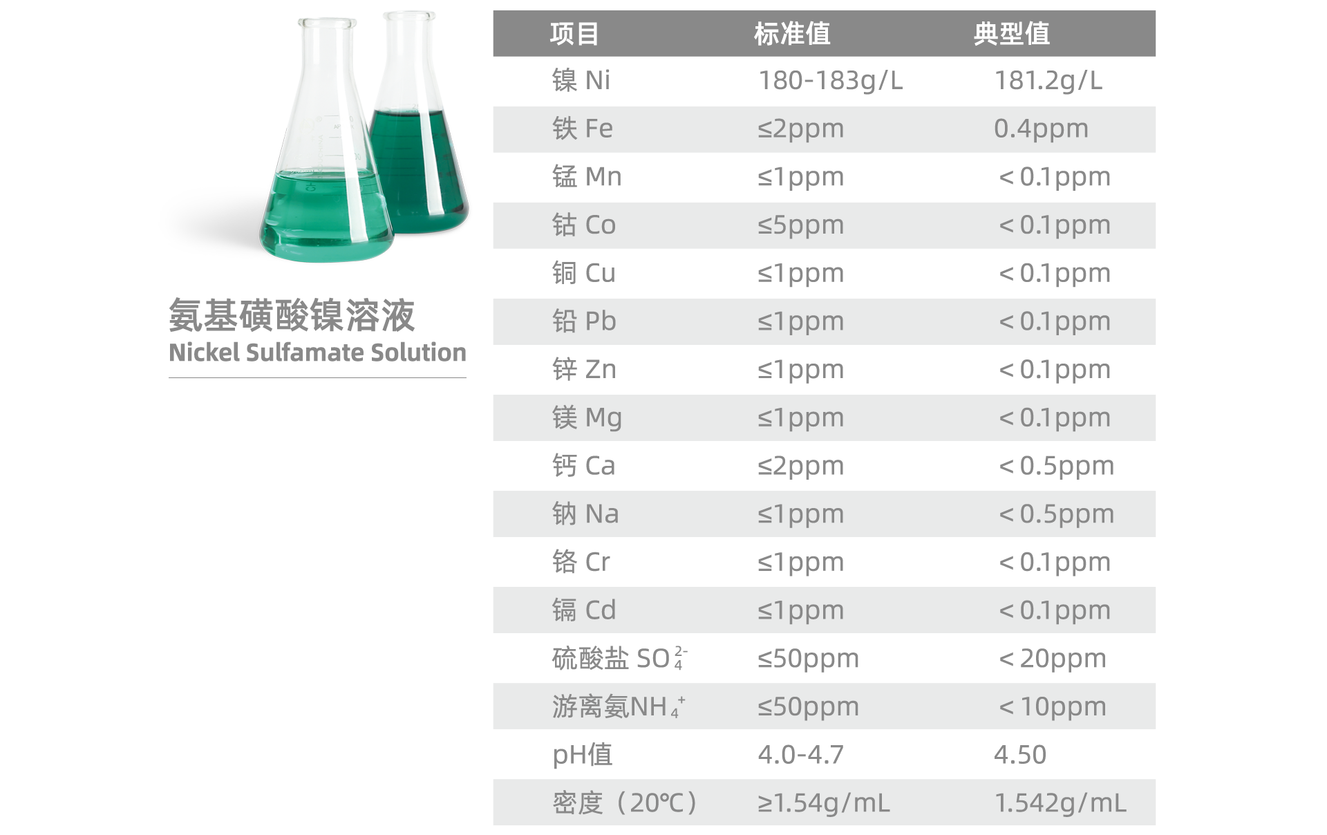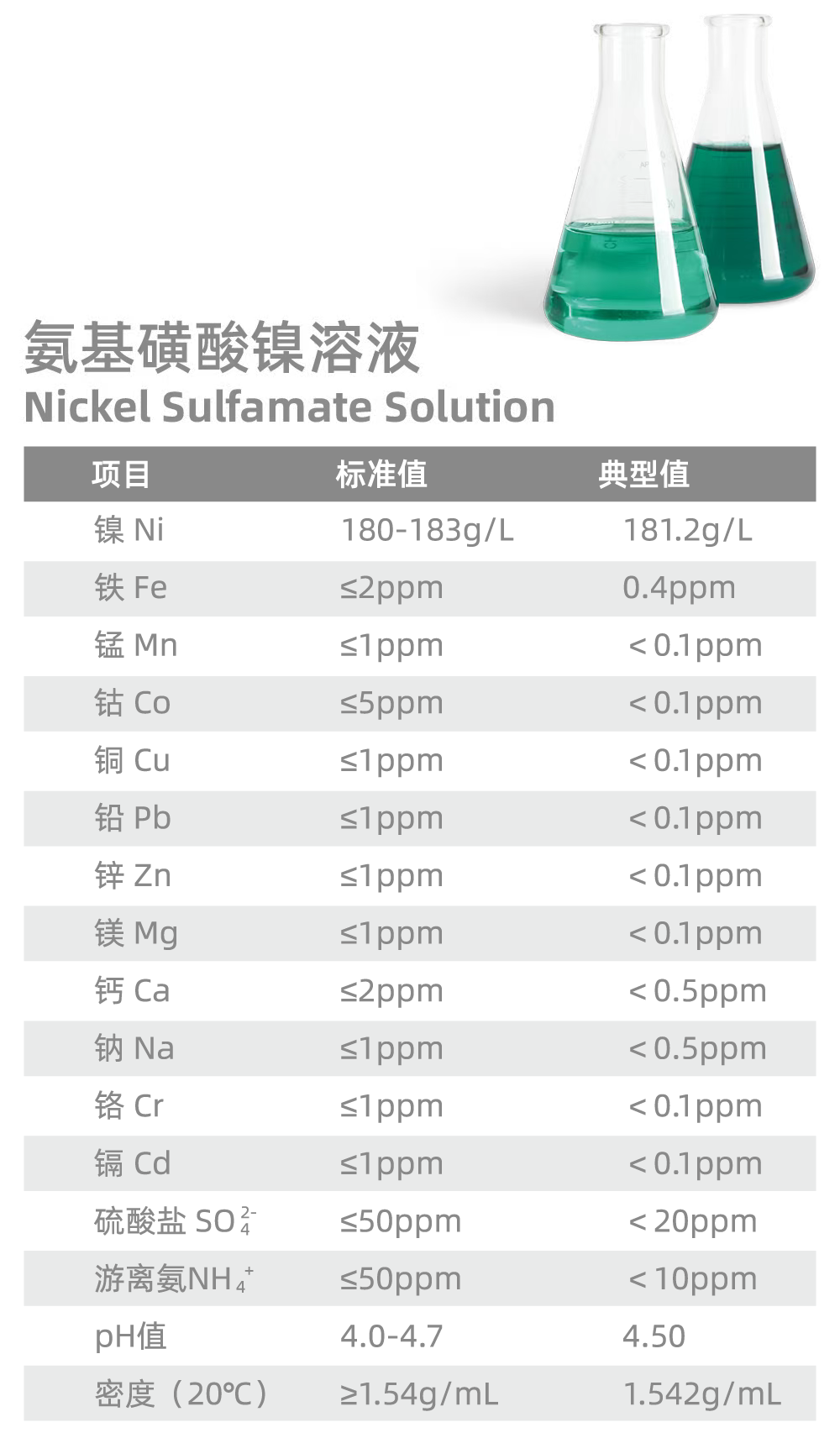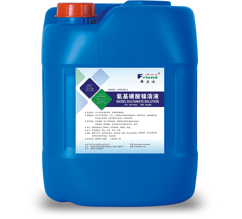 氨基磺酸鎳溶液(Nickel Sulfamate Solution) 分 子式:Ni(NH2SO3)2 分子量:250.87 性 狀:深綠色透明液體。 用 途:主要用于精密電鍍、電鑄、電子工業(yè)等。 包 裝:HDPE桶裝,每桶30公斤。 儲 運:運輸時包裝要密封,運輸過程中防止受熱,貯存在陰涼,通風(fēng)處。